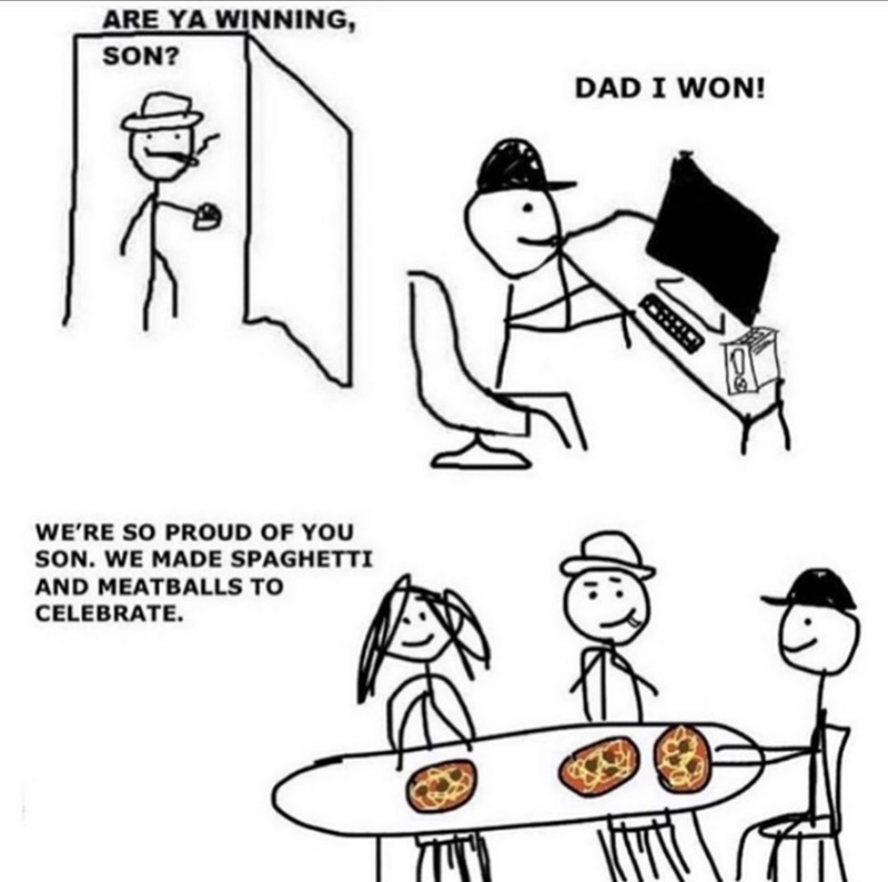 Press f to pay respect to his fallen brain cells from dankmemes. Is an exploitable image series based on an ms paint webcomic in which a father walks in on his son playing a hentai virtual reality game and asks are ya winning son origin while the exact origin of the comic is unknown it may have originated from 4chan due to the use of the name anon kun a reference to the site s. See more coraline s dad are you winning dad images on know your meme. A reference to belle delphine s new music video. Are you winning dad. Are you winning dad popular memes on the site ifunny co. Log in or sign up to leave a comment log in sign up.