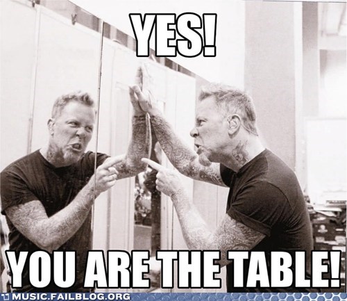 James hetfield table meme. Here at teamrock hq we ve been doing a lot of work on metallica since the band released a new single late on thursday evening. 29 metallica frontman james hetfield talked about what it feels like to have all those i am the table memes floating around the web saying he loves it. The first table remix appeared on helvian s channel where he remixed chop suey. Share on facebook share on twitter e mail. A band or celebrity can t take a misstep without it being turned into a sarcastic image which will normally spread like wildfire. A long time vintage car enthusiast james had been restoring classic cars for many years and has honed his welding skills while doing so. 10 metal bands who became memes duration.