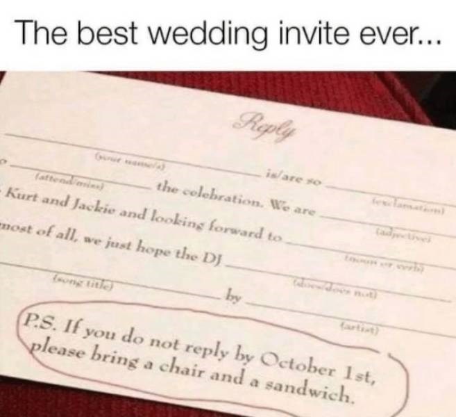 Meme wedding invitation. Wedding invitations save the dates change the dates wedding postponements wedding announcements will you be my bridesmaid enclosure cards response cards thank you cards. Check out these unique and funny wedding invitations from brides and grooms that you ll want to copy for your own wedding. Pick your favorite invitation design from our amazing selection. From quirky cartoons to a fill in the blank card your invitations will be the talk of the town and set the tone for one memorable wedding. Jun 9 2017 explore natosha mathis s board wedding meme followed by 108 people on pinterest. The best invitations memes and ecards. These couples are very creative.